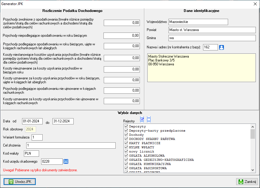 Uwaga! Pobierane są tylko dokumenty zatwierdzone. Oznacza to, że w pliku znajdą się wyłącznie operacje księgowe zatwierdzone w systemie.