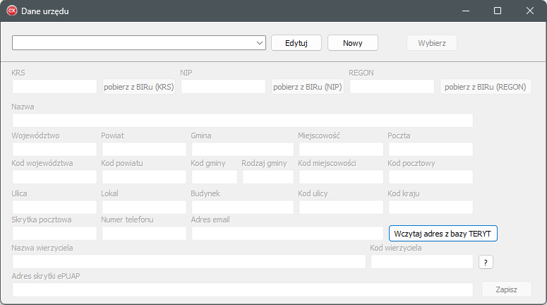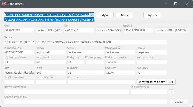 W oknie Dane urzędu możliwe jest: