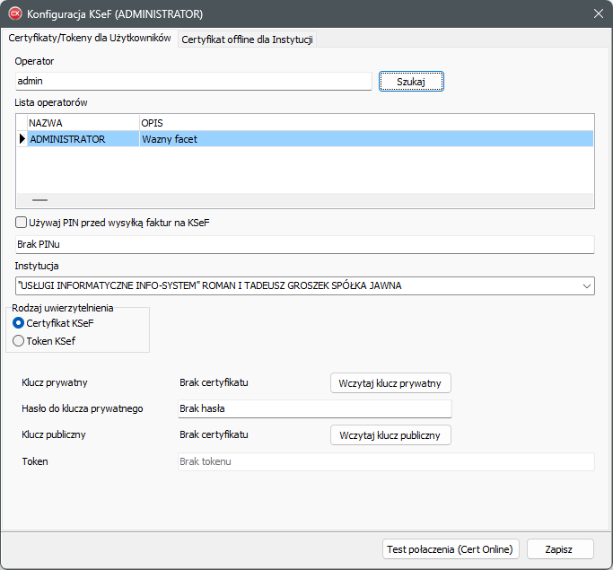 • Konfiguracja KSeF – konfiguracja uwierzytelnienia operatorów,
