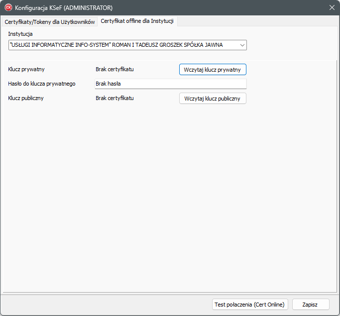 Zakładka Certyfikat offline dla instytucji służy do konfiguracji certyfikatu KSeF (typ 2), wykorzystywanego w trybach szczególnych KSeF, takich jak: