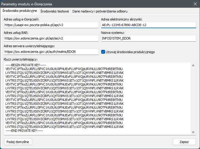 Po uzupełnieniu danych zaznaczamy parametr Używaj środowiska produkcyjnego i zapisujemy wprowadzone parametry klikając na przycisk Zapisz.