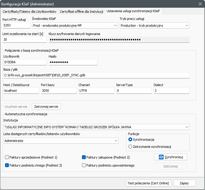 Baza / plik Ścieżka do pliku bazy Np. E:\bazyfb3\IS_KSEF_SYNC.gdb